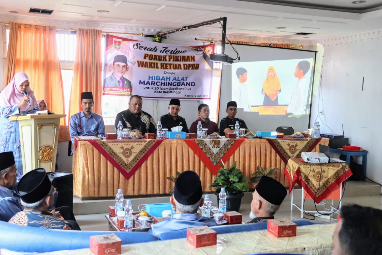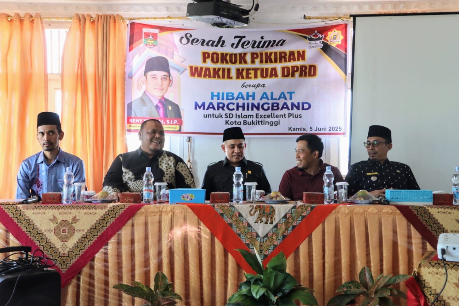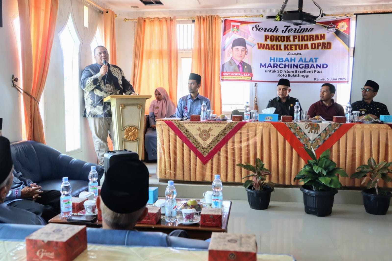 Humas DPRD- Wakil Ketua DPRD Kota Bukittinggi, Beny Yusrial, S.IP serahkan bantuan dana pokok-pokok pikiran (pokir) tahun anggaran 2024-2025 berupa Hibah Alat Marchingband kepada Sherra Dwy Haryanti, S.Pd. kepala Sekolah Dasar (SD) Islam Excellent Plus Kota Bukittinggi, Kamis (5/6/2025) di aula sekolah setempat.