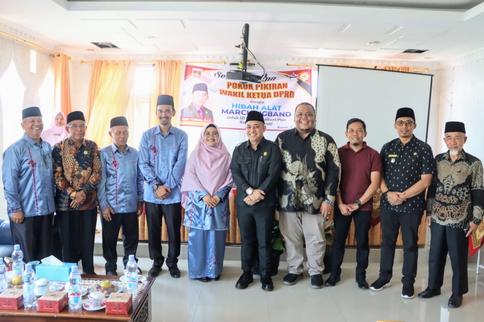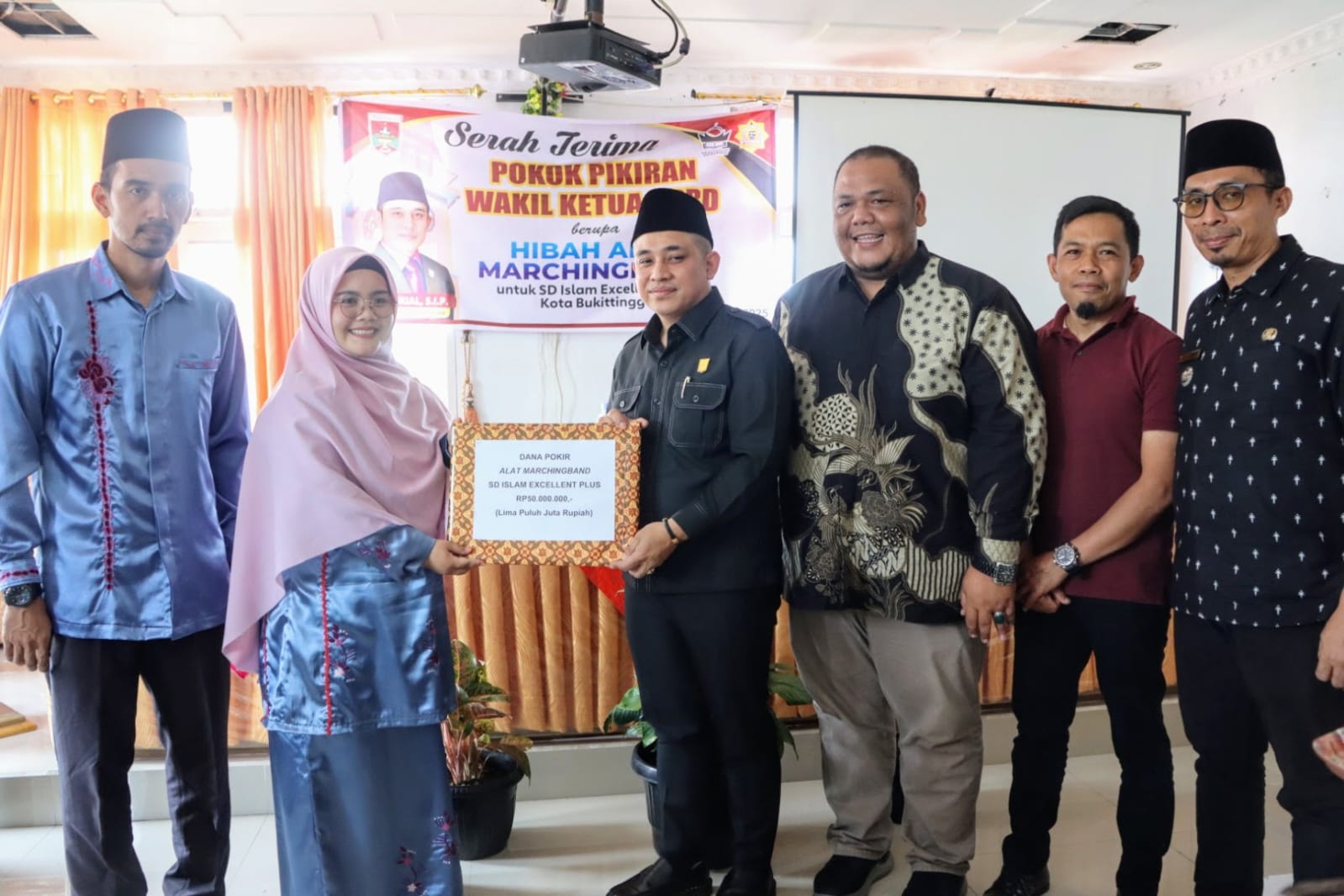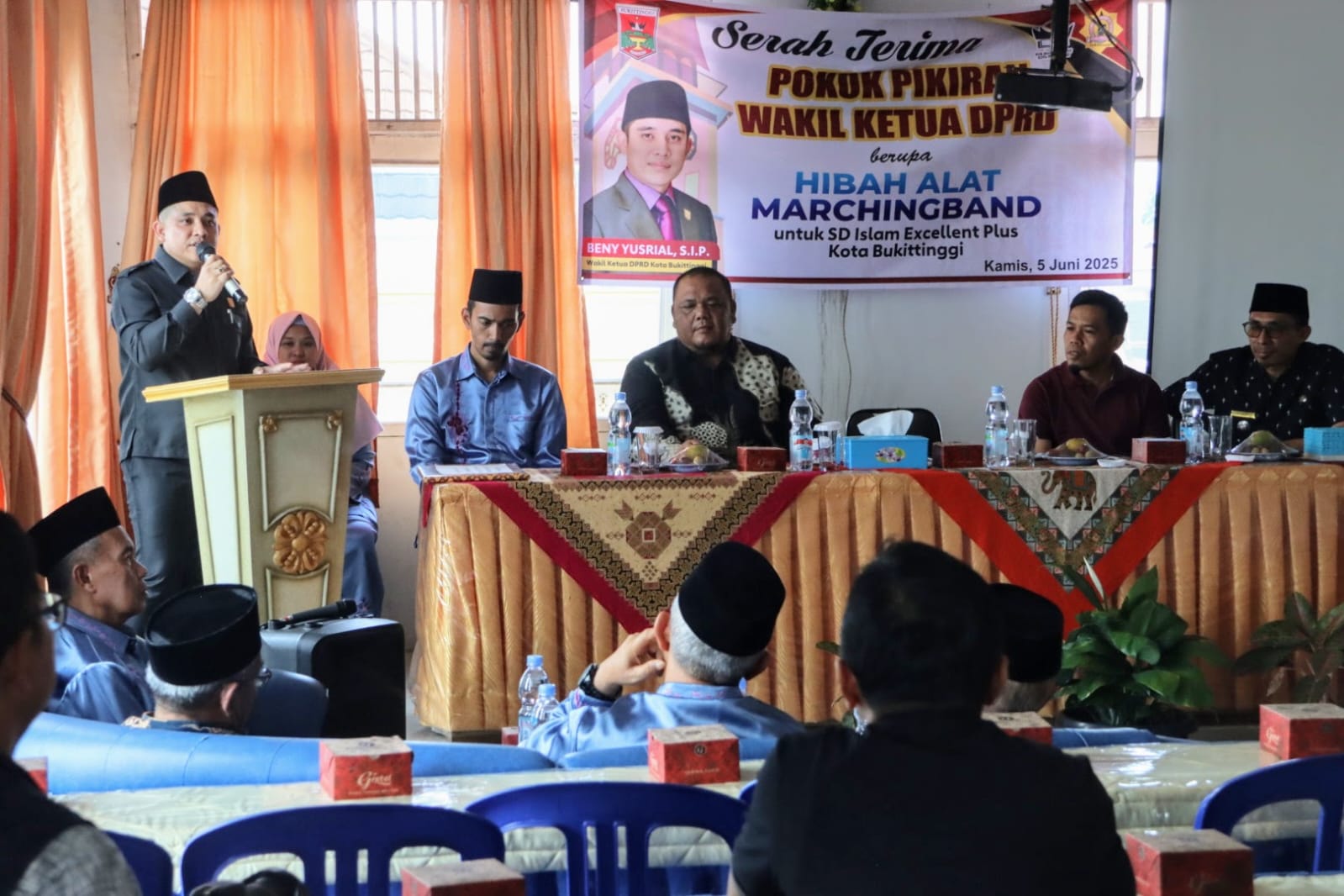 Humas DPRD- Wakil Ketua DPRD Kota Bukittinggi, Beny Yusrial, S.IP serahkan bantuan dana pokok-pokok pikiran (pokir) tahun anggaran 2024-2025 berupa Hibah Alat Marchingband kepada Sherra Dwy Haryanti, S.Pd. kepala Sekolah Dasar (SD) Islam Excellent Plus Kota Bukittinggi, Kamis (5/6/2025) di aula sekolah setempat.