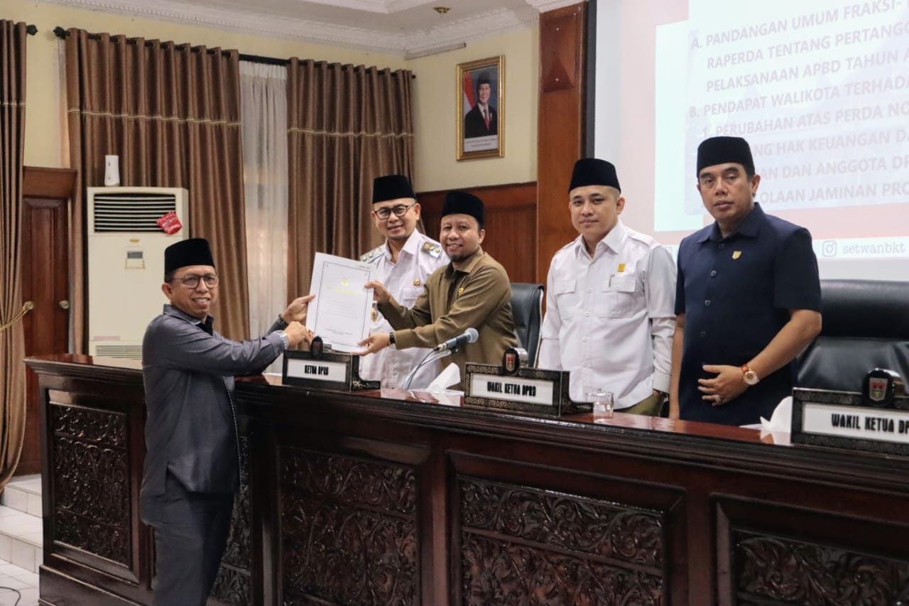 Dalam rangka melaksanakan fungsi pembentukan Peraturan Daerah DPRD Kota Bukittinggi telah menginisiasi 2 (dua) rancangan Perda yang telah dihantarkan dalam sidang paripurna kemarin Selasa, tanggal 10 Juni 2025 yakni Peraturan Daerah tentang: 1. Perubahan Atas Perda Nomor 1 Tahun 2017 tentang Hak Keuangan Dan Administratif Pimpinan Dan Anggota DPRD Kota Bukittinggi: dan 2. Pengelolaan Jaminan Produk Halal. Maka dari itu pada kesempatan ini kami memberikan apresiasi kepada pimpinan dan Anggota DPRD.