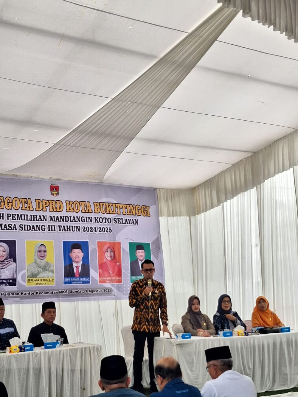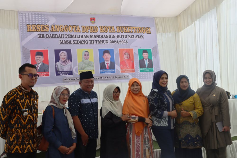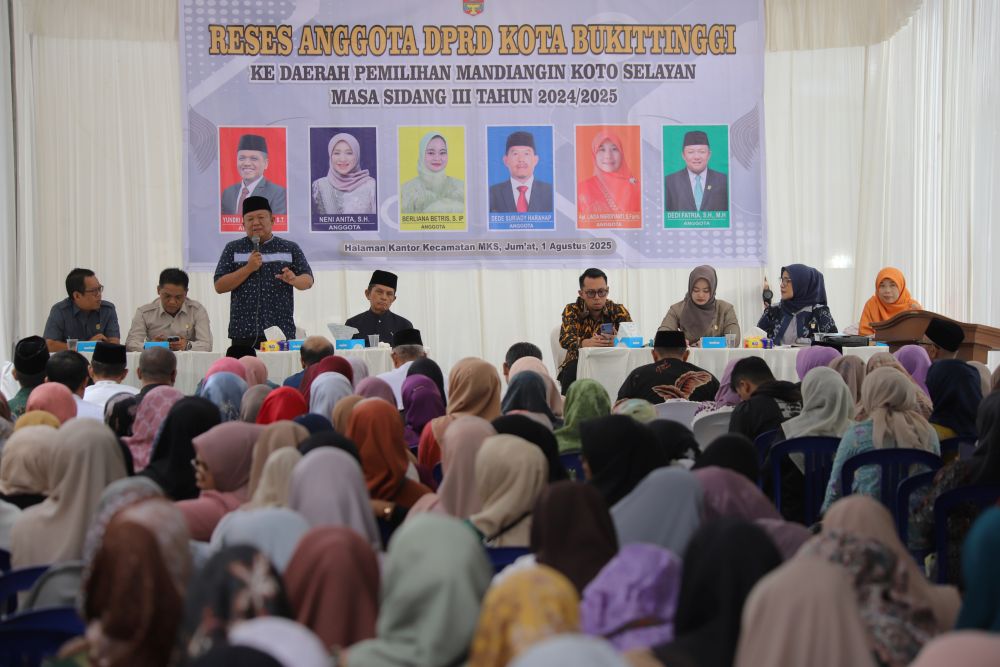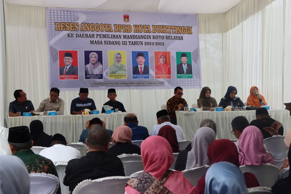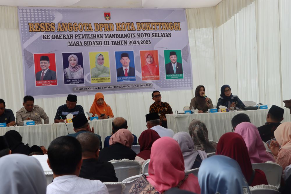 Humas DPRD — Enam orang anggota DPRD Kota Bukittinggi dari Daerah Pemilihan (Dapil) Mandiangin Koto Selayan (MKS) melaksanakan kegiatan reses Masa Sidang III Tahun 2024/2025, bertempat di halaman Kantor Camat MKS. Kegiatan ini merupakan bagian dari pelaksanaan fungsi representasi anggota dewan untuk menjaring aspirasi masyarakat pada hari Jumat, 1 Agustus 2025. Hadir dalam kegiatan ini OPD yang terkait, Camat, Lurah, RT.RW, Tokoh masyarakat, Ketua Pemuda, Bundo Kanduang, kader kader simpatisan daerah pemilihan, dan Tim Pendamping Sekretariat DPRD Kota Bukittinggi serta media cetak maupun online.