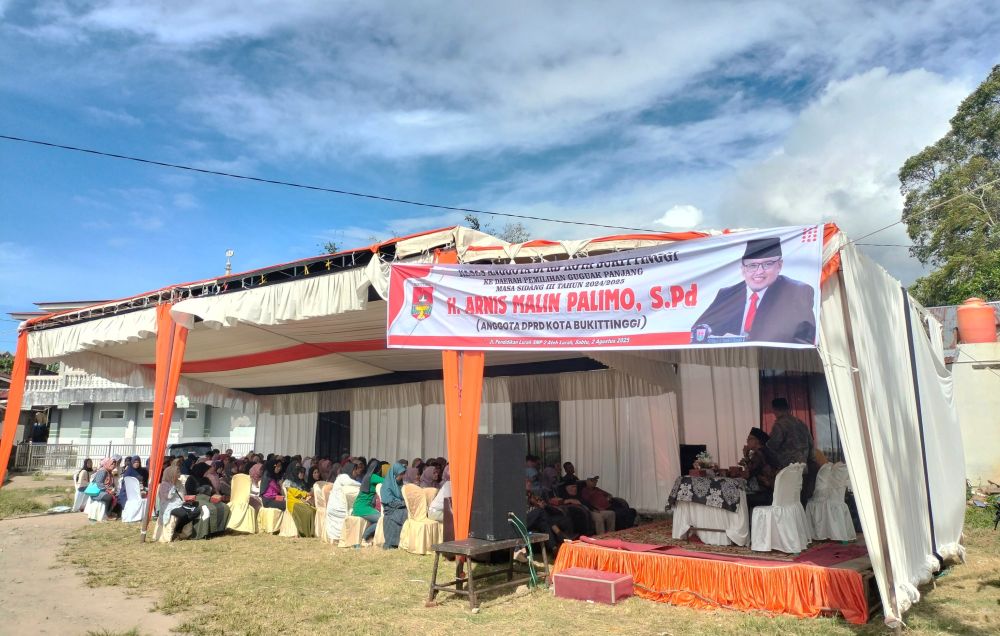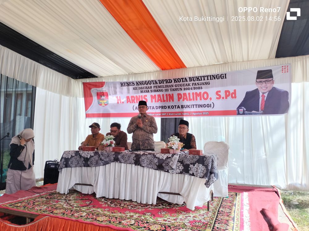 HUMAS DPRD– Anggota DPRD Kota Bukittinggi dari Fraksi Partai Keadilan Sejahtera (PKS), H. Arnis Malin Palimo, S.Pd, melaksanakan kegiatan reses masa sidang III tahun 2024/2025 di kawasan Jl. Pendidikan, Kelurahan Ateh Lurah, Kecamatan Guguak Panjang. Kegiatan ini menjadi momentum untuk menjemput aspirasi warga, khususnya terkait kebutuhan infrastruktur, pendidikan, serta pemberdayaan sosial, Sabtu 2 Agustus 2025.