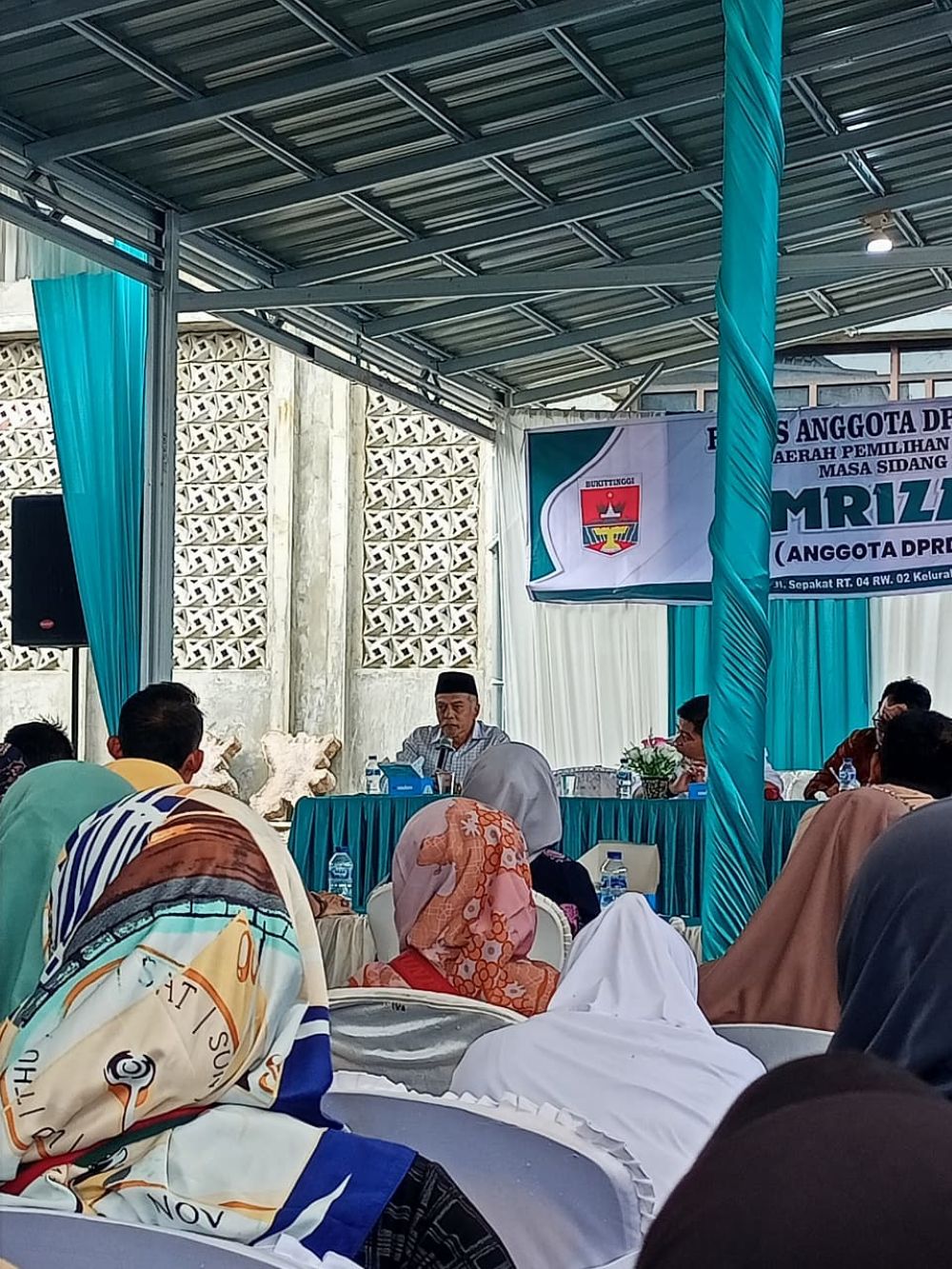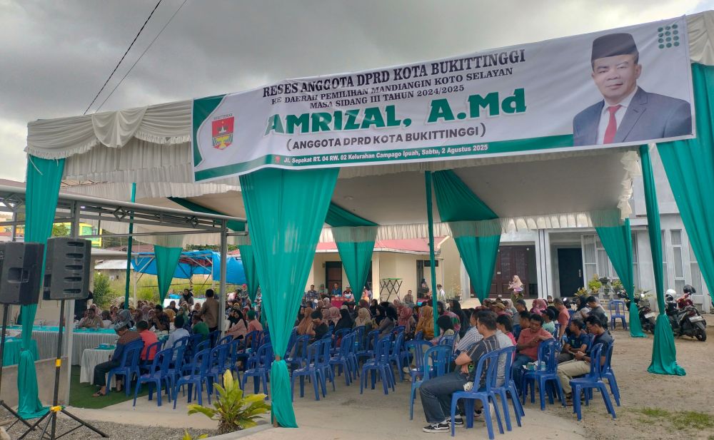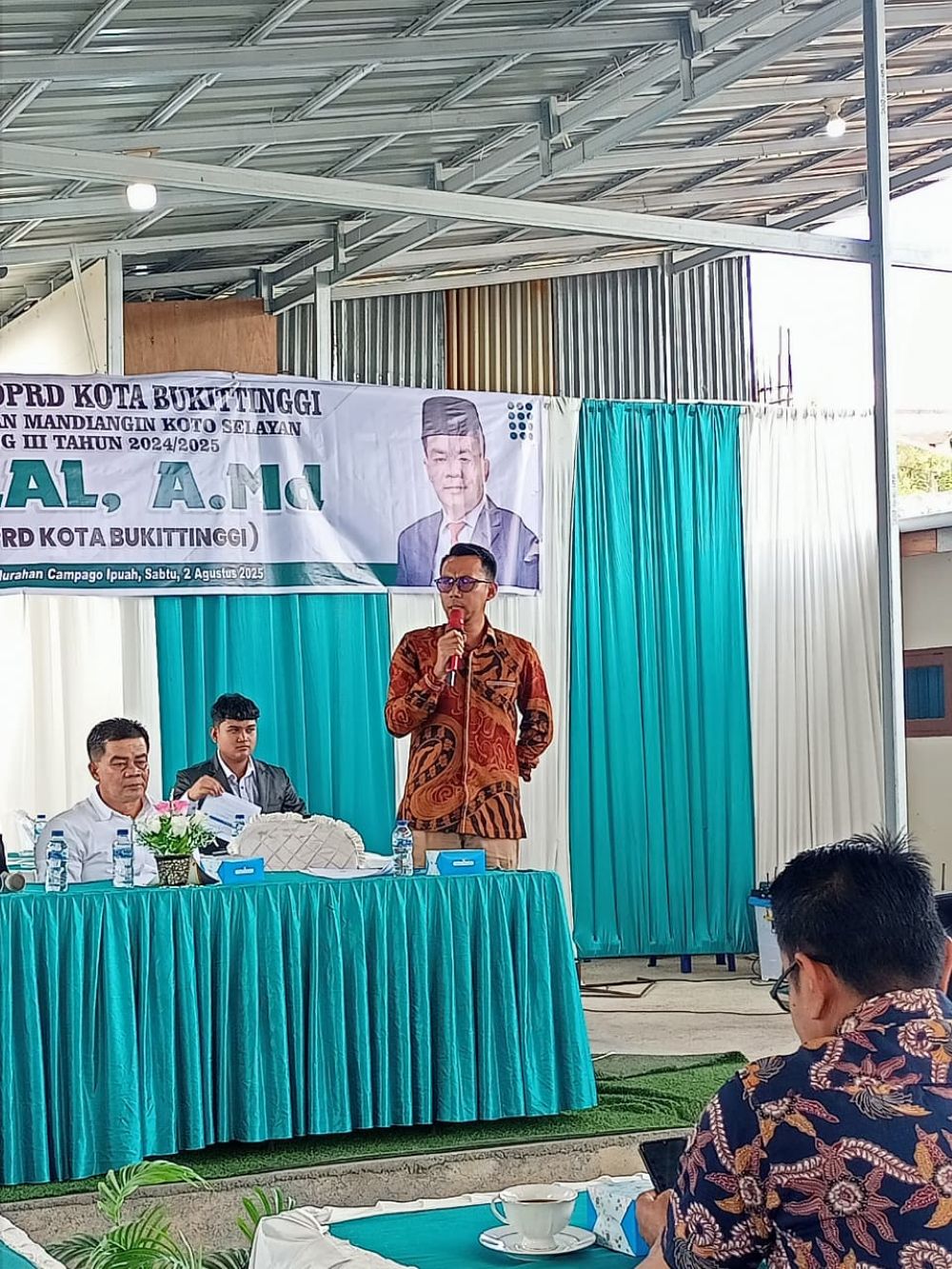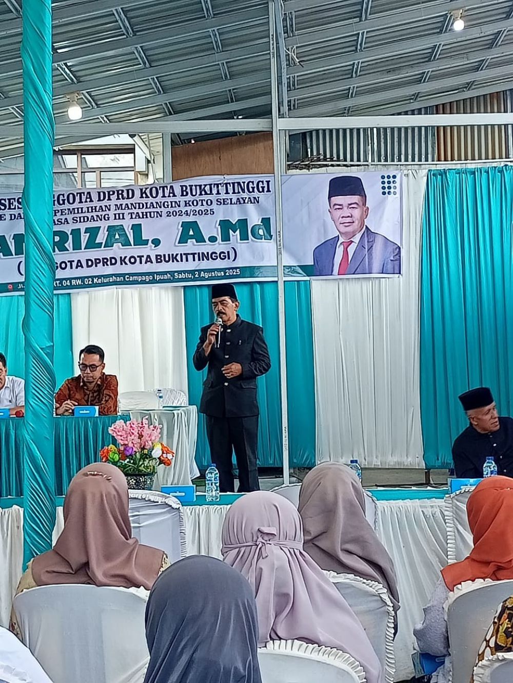 HUMAS DPRD- Anggota DPRD Kota Bukittinggi, Amrizal, A.Md melaksanakan kegiatan reses masa sidang III tahun 2024/2025 di Jalan Sepakat RT 04 RW 02, Kelurahan Campago Ipuah, Kecamatan Mandiangin Koto Selayan. Agenda ini menjadi momentum penting dalam menyerap berbagai aspirasi masyarakat secara langsung, khususnya menyangkut pembangunan SDM, infrastruktur, ekonomi kerakyatan, pendidikan, serta penyesuaian program melalui perubahan anggaran daerah , Sabtu (2/8).