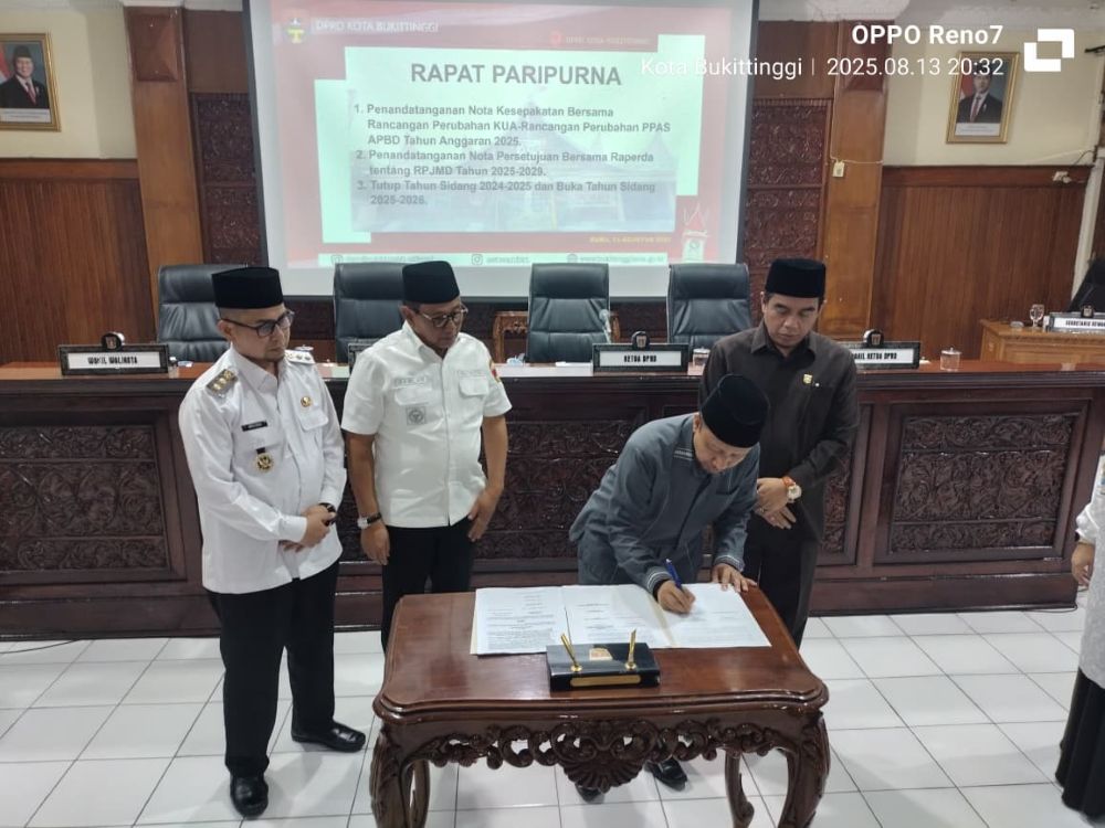 "DPRD Bukittinggi tanda tangani KUA-PPAS Perubahan & RPJMD 2025–2029, serahkan Buku Laporan Pertama 2024–2029 ke Wali Kota."