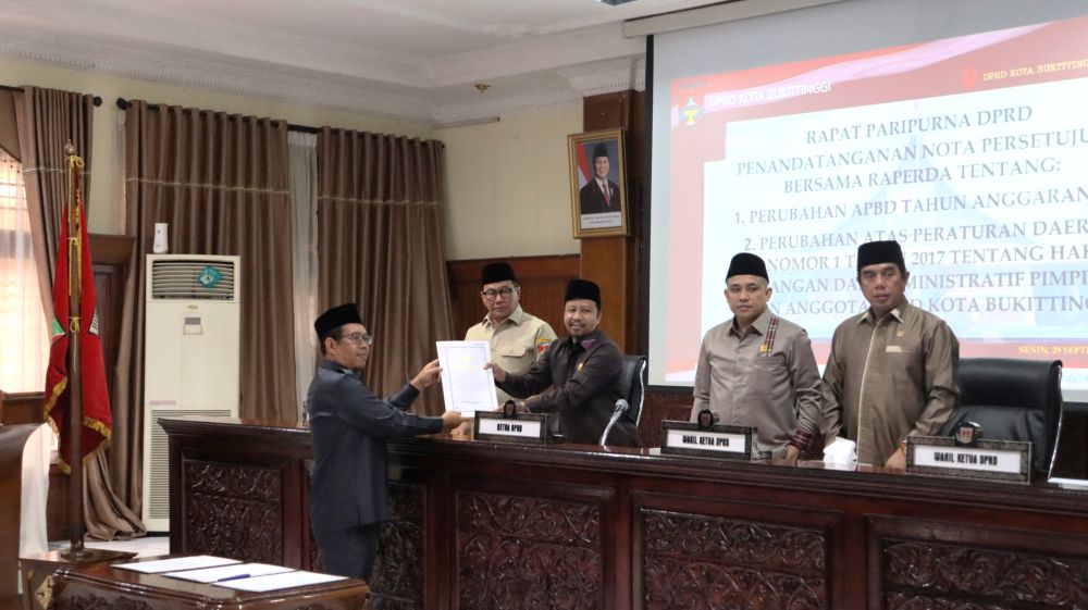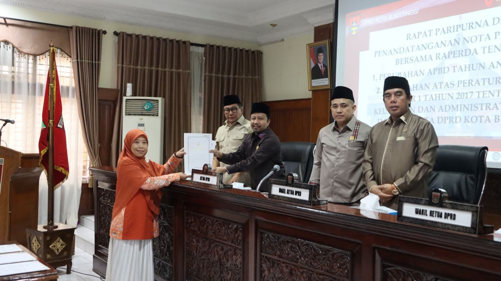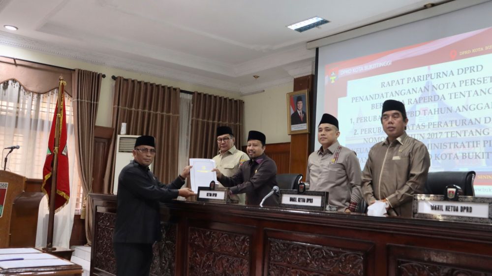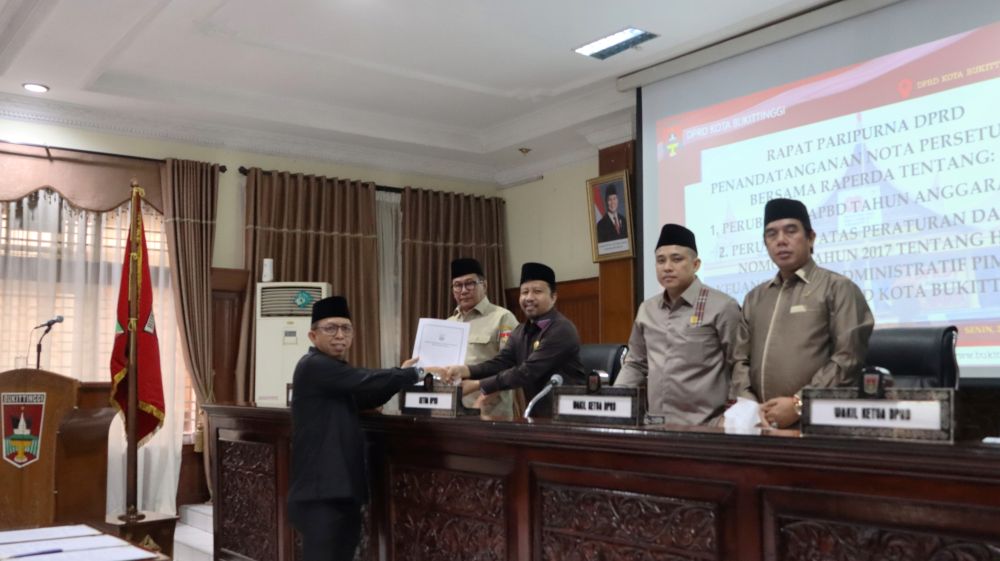 Selanjutnya, kedua nota persetujuan tersebut ditandatangani oleh DPRD dan Pemerintah Kota Bukittinggi. Dengan penandatanganan ini, rapat paripurna DPRD Kota Bukittinggi dinyatakan selesai dan ditutup secara resmi.