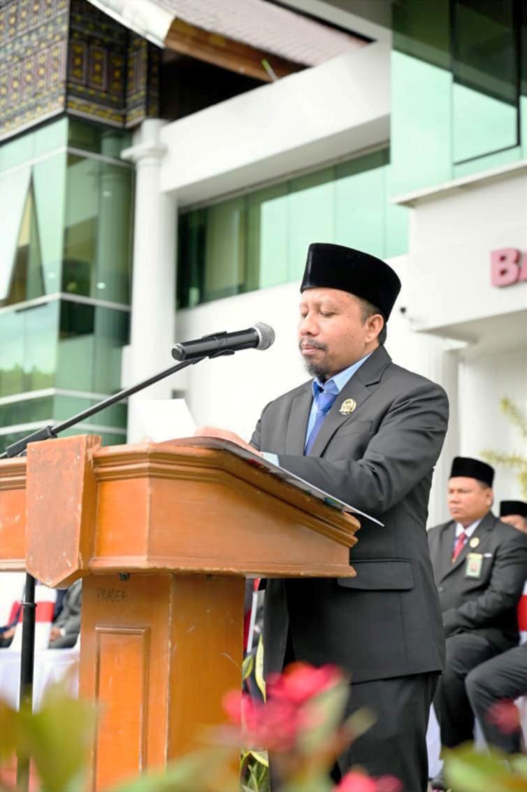 Dalam rangkaian upacara, Ketua DPRD juga berkesempatan membacakan teks upacara, menjadi bagian dari prosesi peringatan yang berlangsung tertib dan penuh penghormatan.