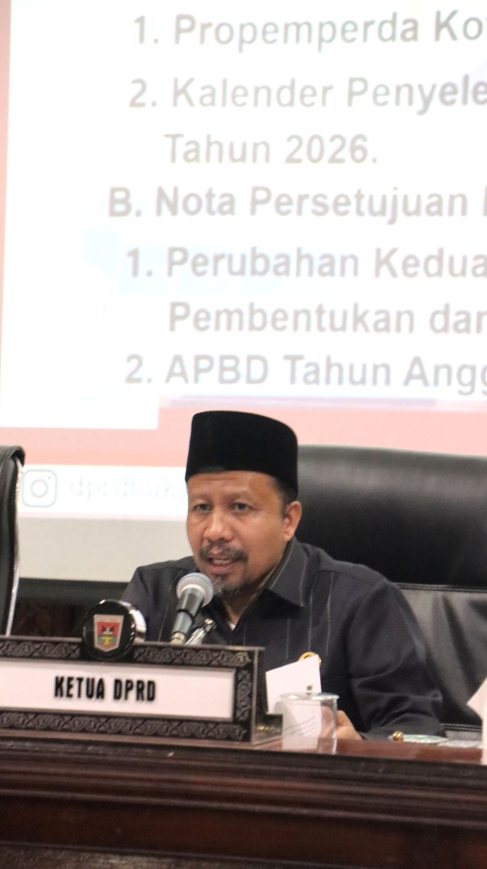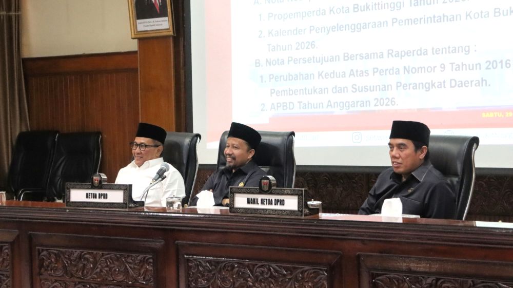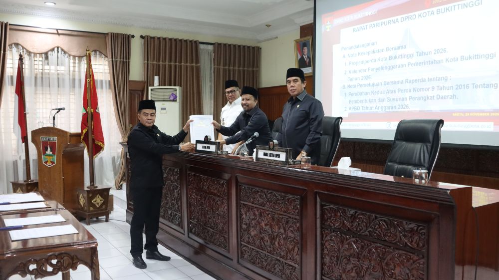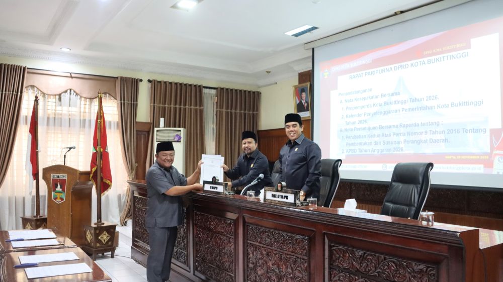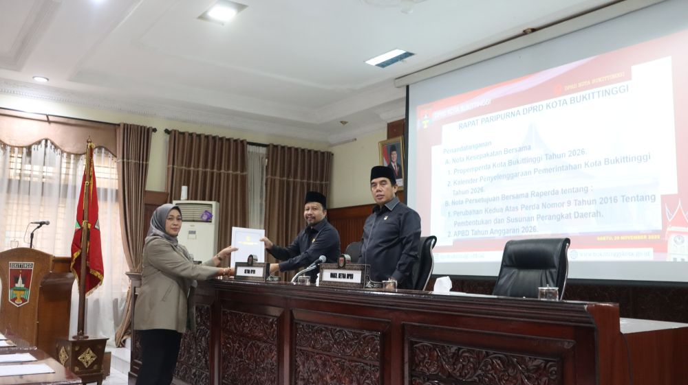Humas DPRD — Dewan Perwakilan Rakyat Daerah (DPRD) Kota Bukittinggi menyelenggarakan Rapat Paripurna bertempat di Ruang Sidang Utama DPRD Kota Bukittinggi. Rapat tersebut digelar dalam rangka penetapan empat dokumen peraturan strategis sebagai dasar arah kebijakan pemerintahan dan pembangunan Kota Bukittinggi Tahun 2026, Sabtu 29 November 2025.
