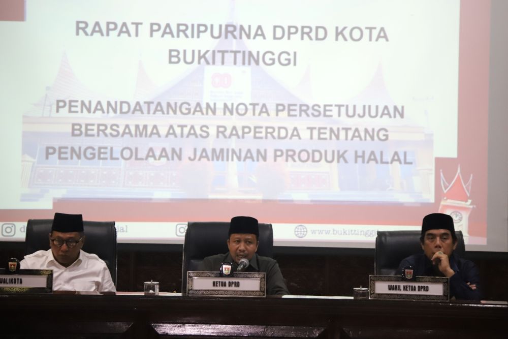 Dalam sambutannya, Ketua DPRD H. Syaiful Efendi, Lc., MA menyampaikan bahwa Ranperda mengenai Pengelolaan Jaminan Produk Halal ini merupakan upaya bersama antara DPRD dan Pemerintah Kota Bukittinggi dalam menghadirkan regulasi yang memberikan perlindungan, kepastian, serta kepercayaan terhadap produk yang beredar di tengah masyarakat.