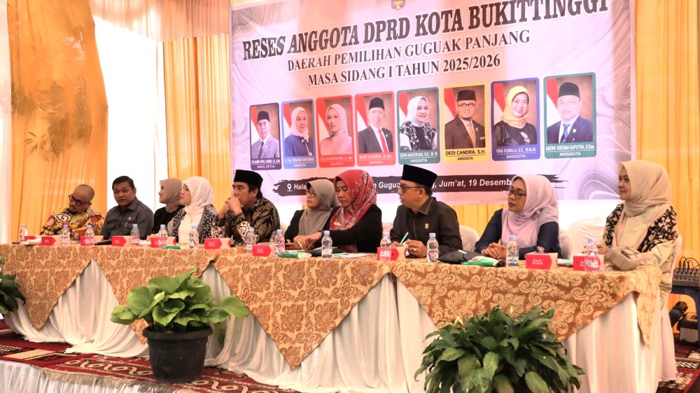 HUMAS DPRD — Anggota DPRD Kota Bukittinggi Daerah Pemilihan (Dapil) Guguak Panjang melaksanakan kegiatan Reses Berkelompok Masa Sidang I Tahun 2025/2026 yang diselenggarakan di Aula Kecamatan Guguak Panjang, Kota Bukittinggi, Jumat (19/12/2025).